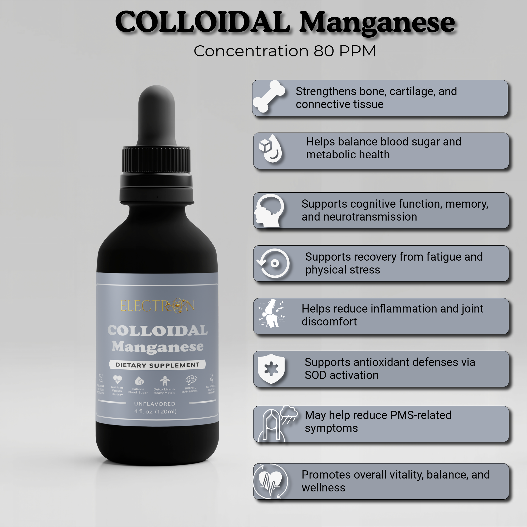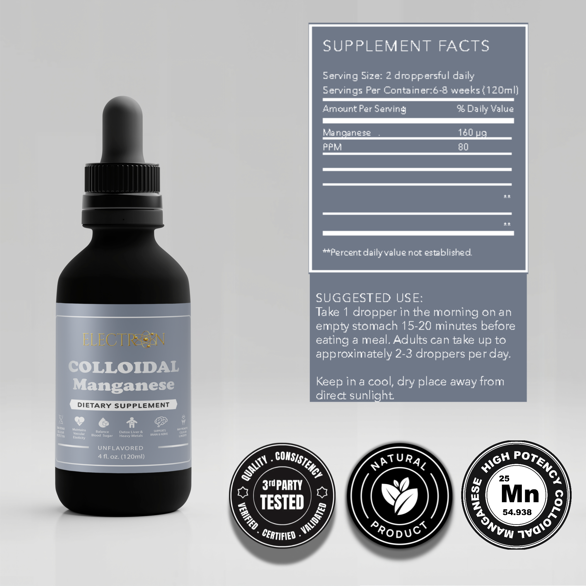 In this colloidal state, manganese remains highly bioavailable and does not rely on chemical salts, binders, or synthetic compounds for absorption. Because it is delivered in a particle-based liquid form, significantly more manganese is available for cellular utilization compared to conventional supplements, which can lose a large portion of their effectiveness during digestion.
